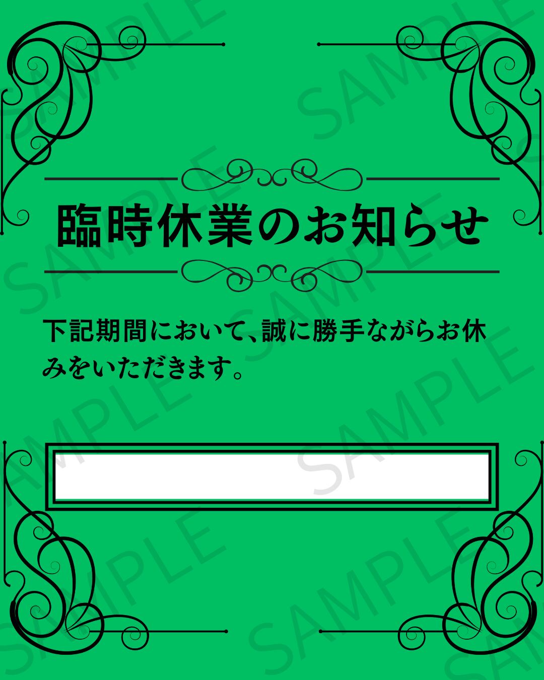 【Instagram投稿用】日付入りの臨時休業のお知らせ画像 デザイン3(グリーン)