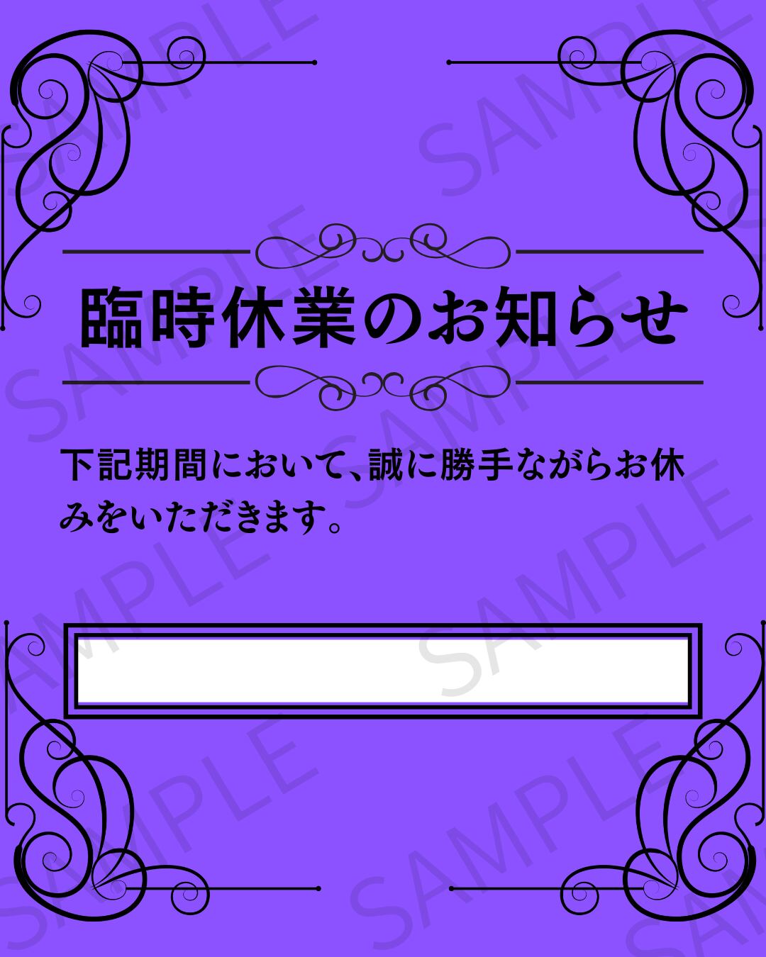 【Instagram投稿用】日付入りの臨時休業のお知らせ画像 デザイン3(パープル)