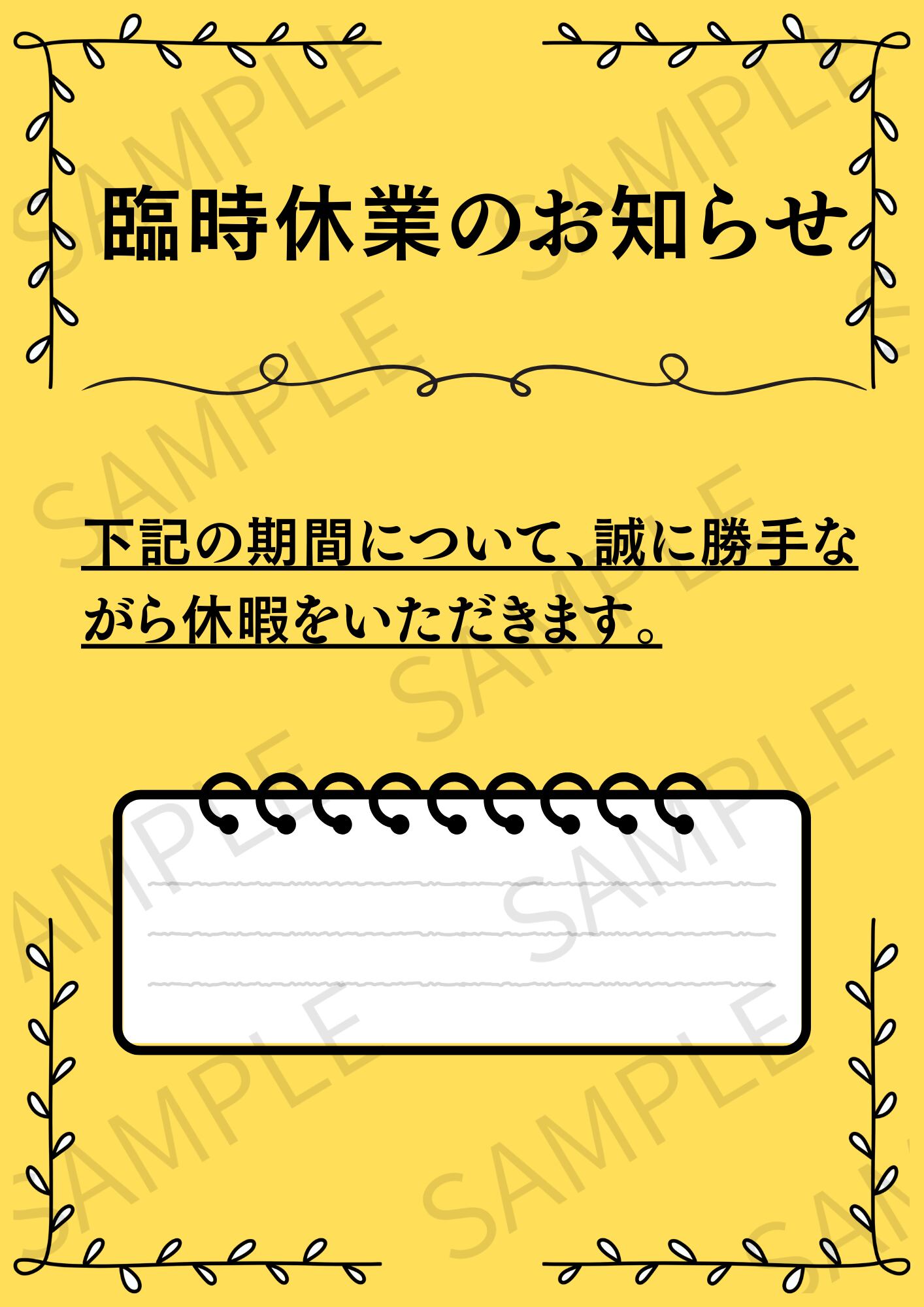 【A4ポスター用】日付入りの臨時休業のお知らせ画像 デザイン5(イエロー)