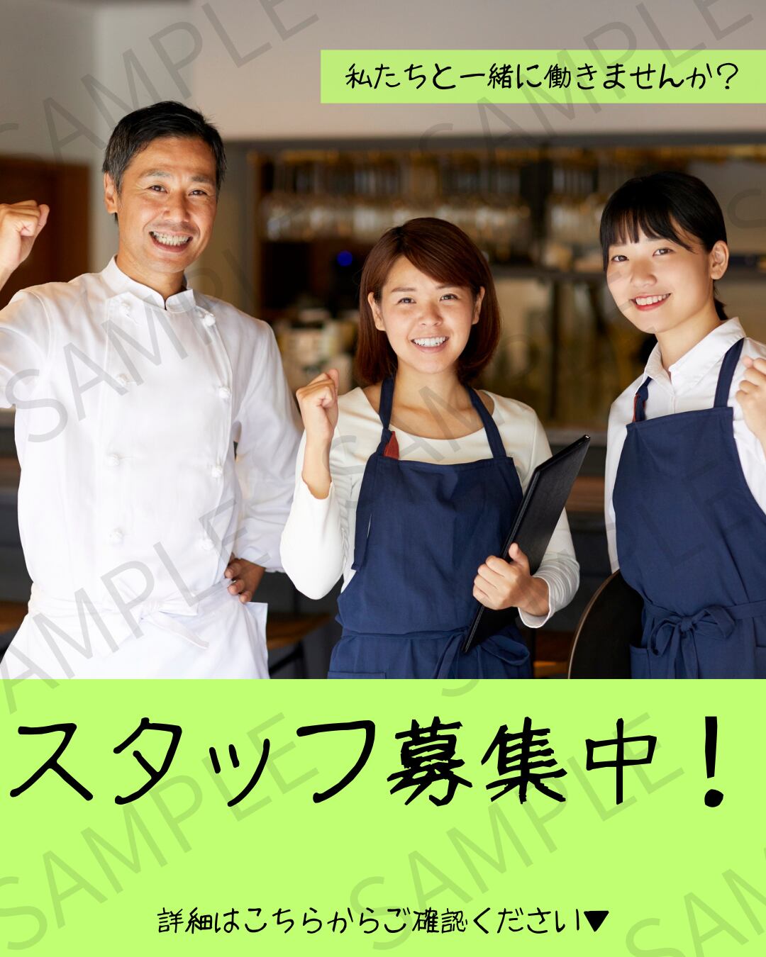 飲食店でご利用いただける「スタッフ募集」用のInstagram投稿サイズ(4:5比率)の画像です。