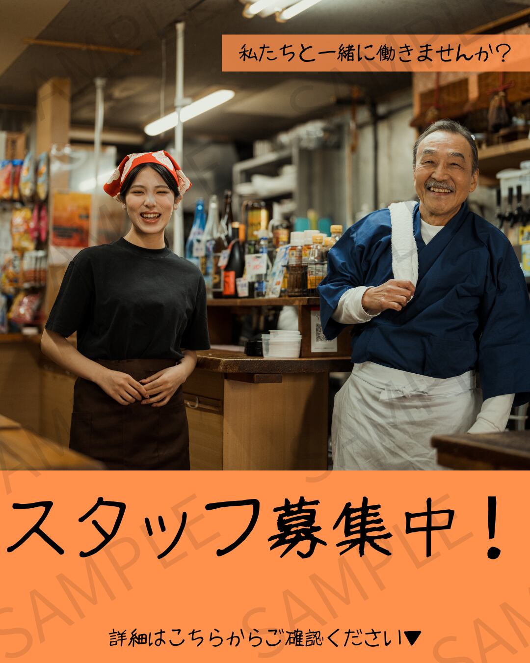 飲食店でご利用いただける「スタッフ募集」用のInstagram投稿サイズ(4:5比率)の画像です。