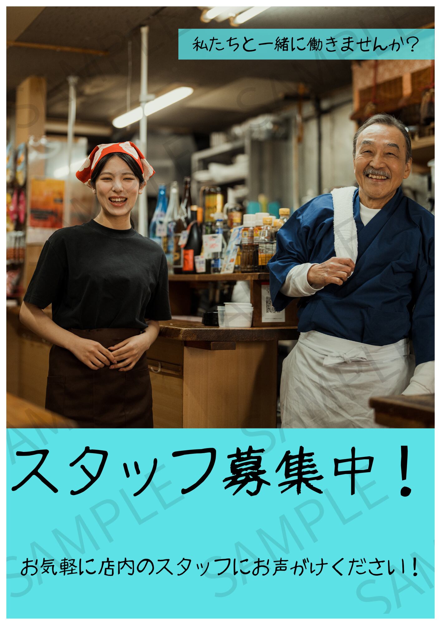 飲食店でご利用いただける「スタッフ募集」用の店内POPで使用できるA4ポスターの画像です。