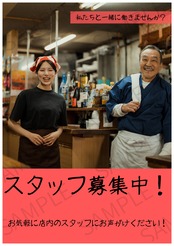 飲食店でご利用いただける「スタッフ募集」用の店内POPで使用できるA4ポスターの画像です。