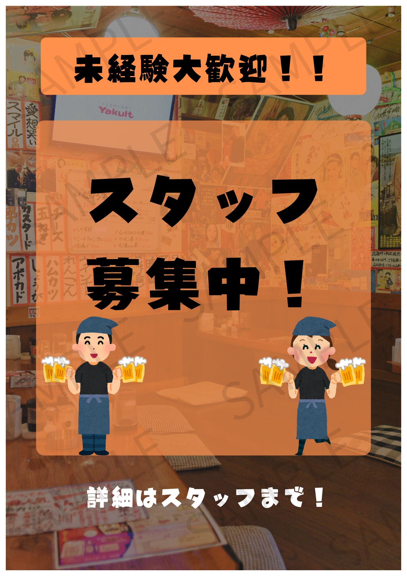 飲食店でご利用いただける「スタッフ募集」用の店内POPで使用できるA4ポスターの画像です。