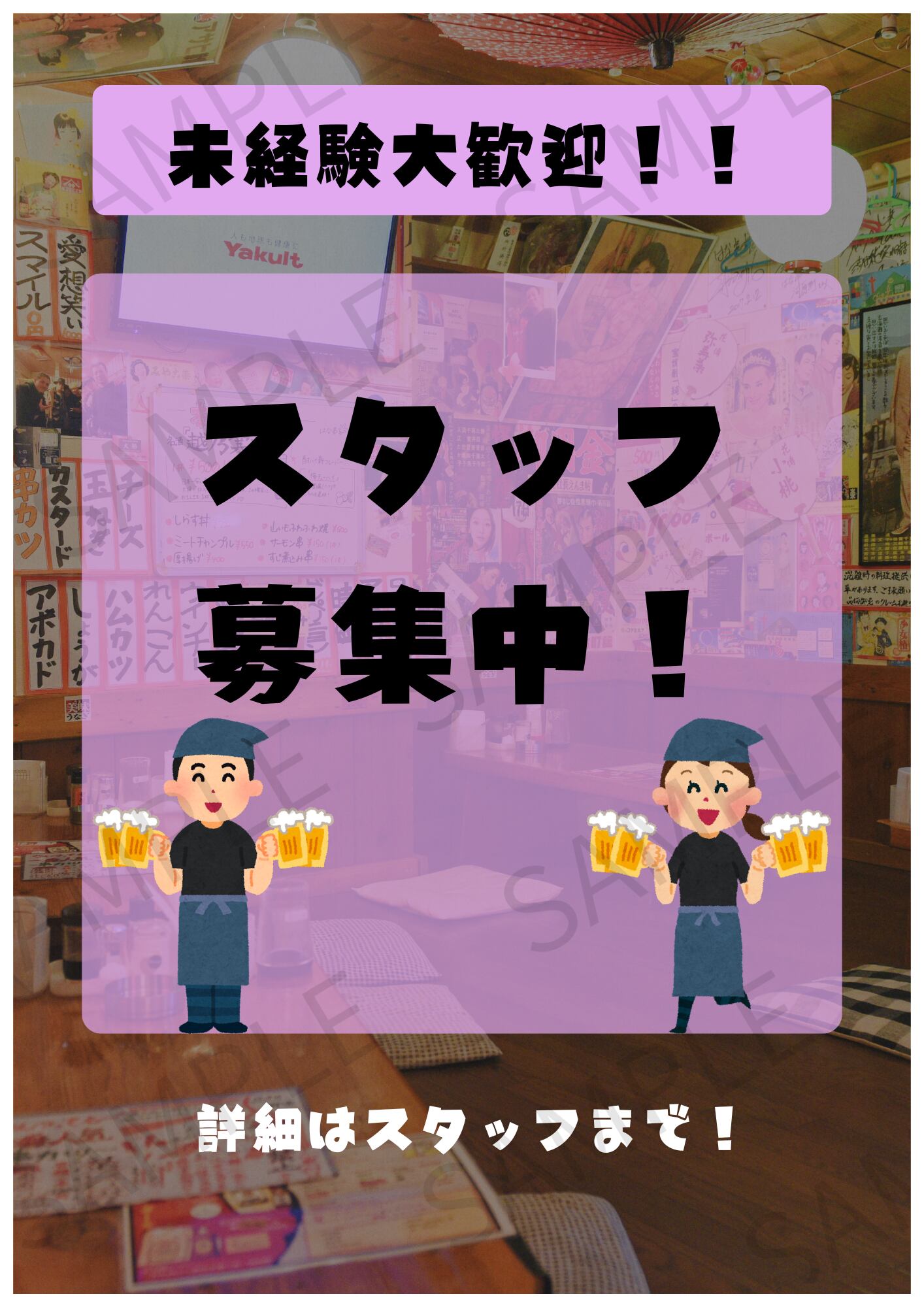 飲食店でご利用いただける「スタッフ募集」用の店内POPで使用できるA4ポスターの画像です。